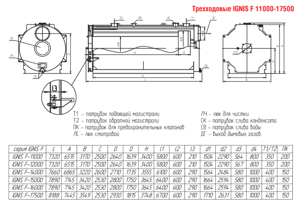 Технические характеристики водогрейного трёхходового котла ARCUS IGNIS F-17500
